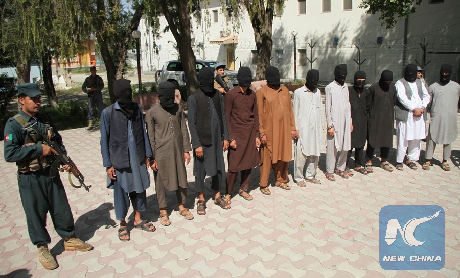 Suspected Talibanmilitants stand handcuffed in Jalalabad city, Nangarhar province, Afghanistan, Sept. 18, 2017. Afghan security personnel captured 13 suspected Taliban militants during an operation in Nangarhar province, a local official said. (Xinhua/Rahman Safi)