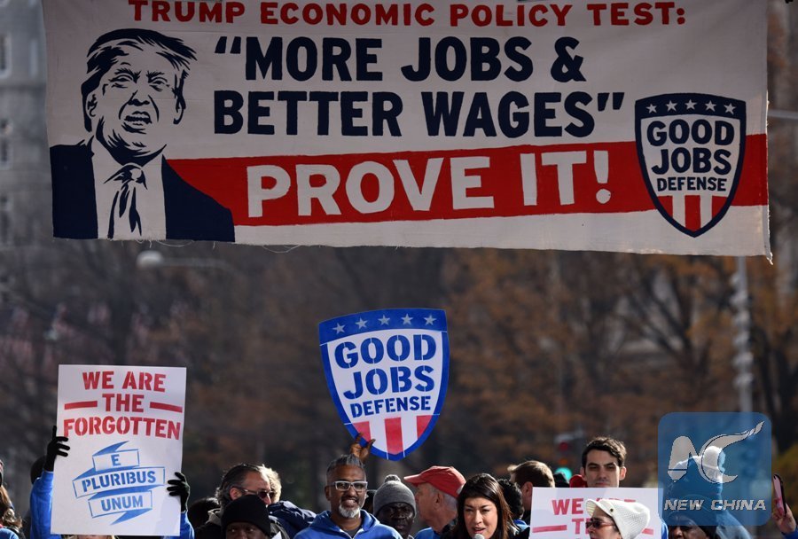 File photo taken on Dec. 7, 2016 shows people attending a rally calling for "more jobs and better wages" which was promised by Donald J. Trump during his campaign, in Washington D.C., the United States. (Xinhua/Yin Bogu)