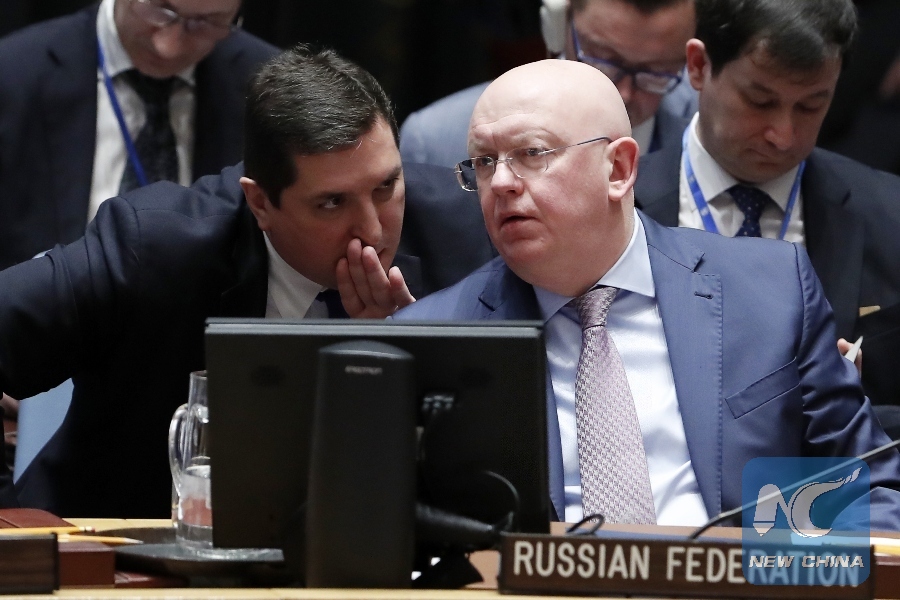 Russian Ambassador to the United Nations Vassily Nebenzia (front) listens to Vladimir Safronkov (L, 2nd row), Russian deputy ambassador to UN, during the UN Security Council meeting on the situation in Syria at the UN headquarters in New York, April 9, 2018. The Security Council held an emergency session on the situation in Syria, particularly after reports of the use of chemical weapons over the weekend in rebel-held Douma near the capital city of Damascus. (Xinhua/Li Muzi)