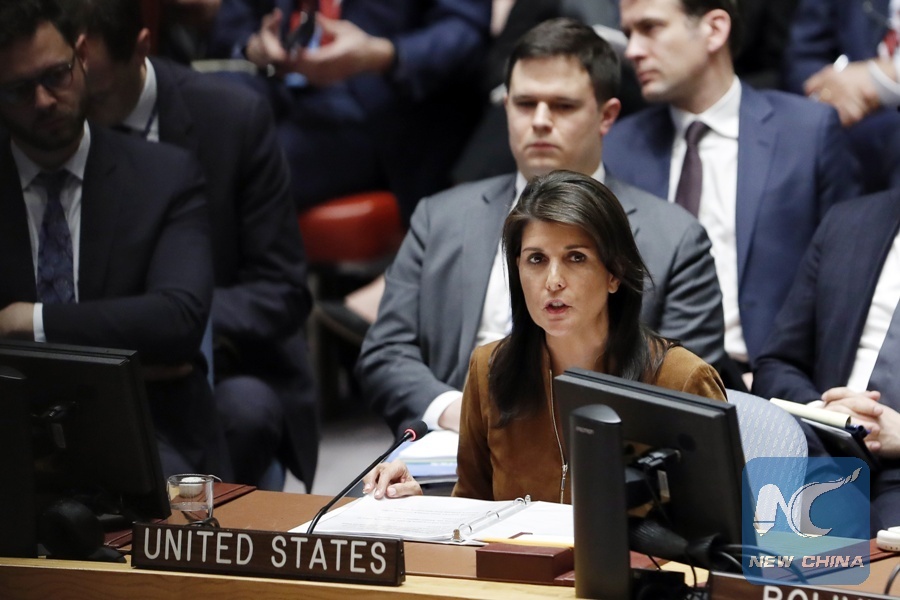 U.S. Ambassador to the United Nations Nikki Haley (front) addresses the UN Security Council meeting on the situation in Syria at the UN headquarters in New York, April 9, 2018. (Xinhua/Li Muzi)