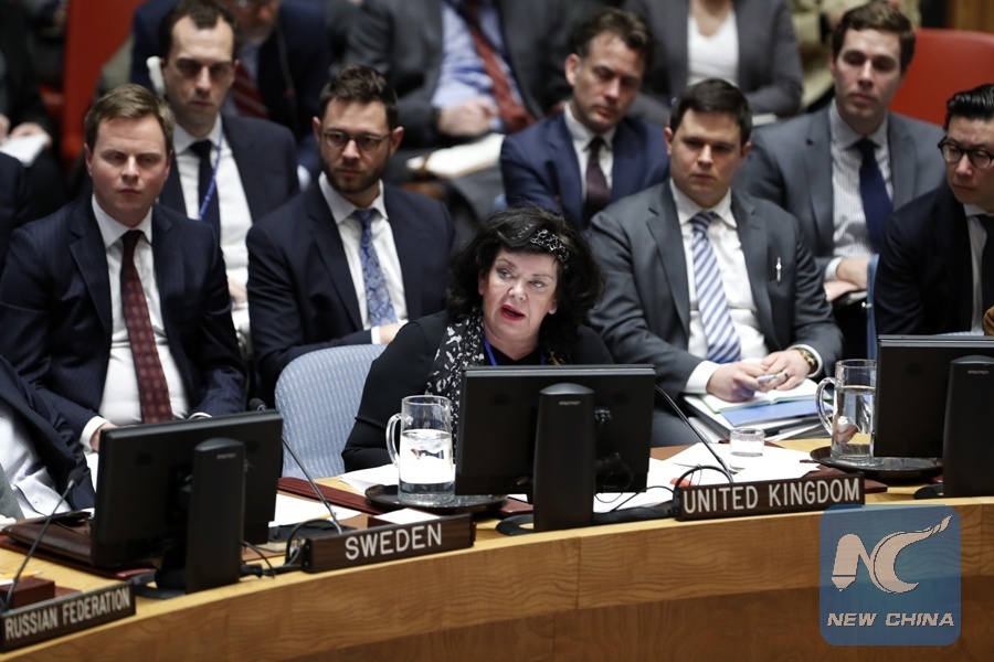 Karen Pierce (front), British Ambassador to the United Nations, addresses the UN Security Council meeting on the situation in Syria, at the UN headquarters in New York, April 9, 2018. (Xinhua/Li Muzi)