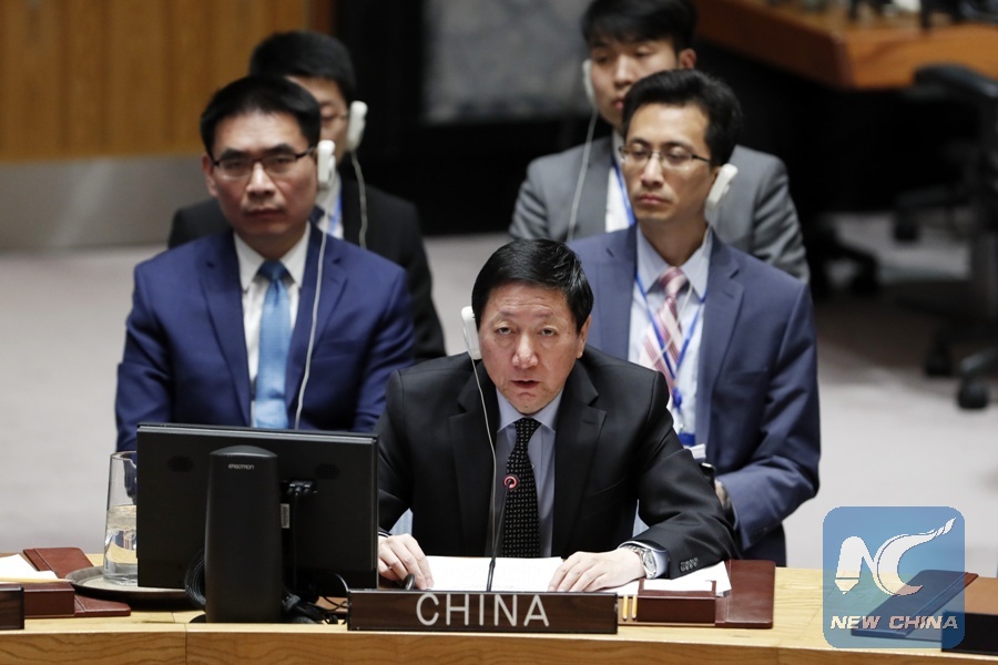 Wu Haitao, China's deputy permanent representative to the United Nations, addresses a meeting of the UN Security Council on the chemical weapon use in Syria, at the UN headquarters in New York April 9, 2018. (Xinhua/Li Muzi)