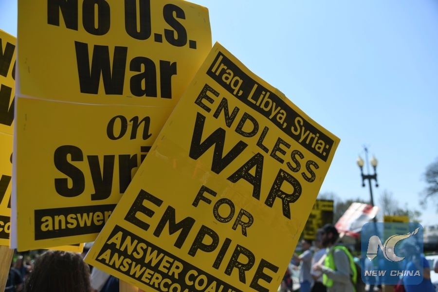 People protest against the U.S. strike on Syria outside the White House in Washington D.C., the United States, on April 14, 2018. (Xinhua/Yang Chenglin)