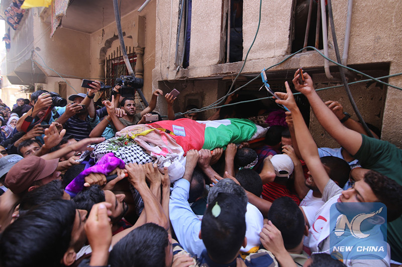 GAZA, June 2 (Xinhua) -- Thousands of outraged Palestinian mourners buried on Saturday a female paramedic who was shot dead by Israeli gunfire close to Gaza's border with Israel.