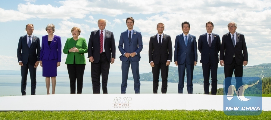 Participants of the Group of Seven (G7) summit European Union Council President Donald Tusk, British Prime Minister Theresa May, German Chancellor Angela Merkel, U.S. President Donald Trump, Canadian Prime Minister Justin Trudeau, French President Emmanuel Macron, Japanese Prime Minister Shinzo Abe, Italian Prime Minister Giuseppe Conte and European Commission President Jean-Claude Juncker (from L to R) pose for a group photo on the first day of the G7summit in La Malbaie, Quebec, Canada, June 8, 2018. (Xinhua/POOL)