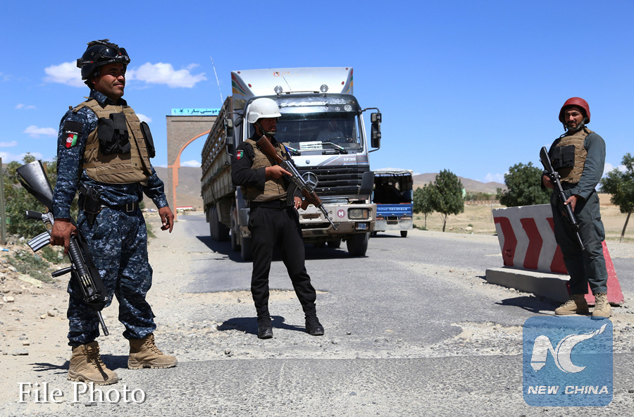 Afghan security members stand guard at a checkpoint after Taliban attacks on Dih Yak and Jaghato districts in Ghazni city, capital of Ghazni province, Afghanistan, May 22, 2018. (Xinhua/Sayed Mominzadah)