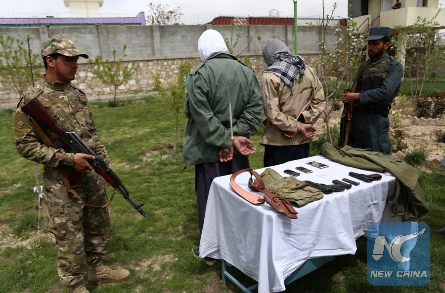 File Photo: Suspected Taliban militants stand handcuffed after being arrested in Ghazni city, capital of Ghazni province, Afghanstan, April 10, 2018. Afghan security personnel captured two suspected Taliban militants during a military operation in Ghazni province, eastern Afghanistan, a local official said. (Xinhua/Sayed Mominzadah)