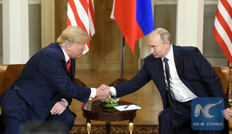 U.S. President Donald Trump (L) shakes hands with his Russian counterpart Vladimir Putin in Helsinki, Finland, on July 16, 2018. (Xinhua/Lehtikuva/Heikki Saukkomaa)