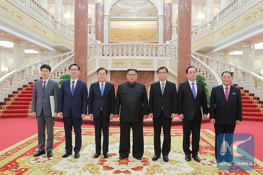 (L-R) Yun Kun-young, a South Korean Blue House official, Chun Hae-sung, vice unification minister of South Korea, Chung Eui-yong, top national security adviser of the Blue House of South Korea, Kim Jong Un, top leader of the Democratic People's Republic of Korea (DPRK), Suh Hoon, chief of the National Intelligence Service (NIS) of South Korea, NIS deputy chief Kim Sang-gyun and Kim Yong Chol, vice chairman of the Workers' Party of Korea (WPK) Central Committee and director of the United Front Department of the DPRK, pose for a photo in Pyongyang, DPRK, on Sept. 5, 2018. (Xinhua/South Korea Presidential Blue House)