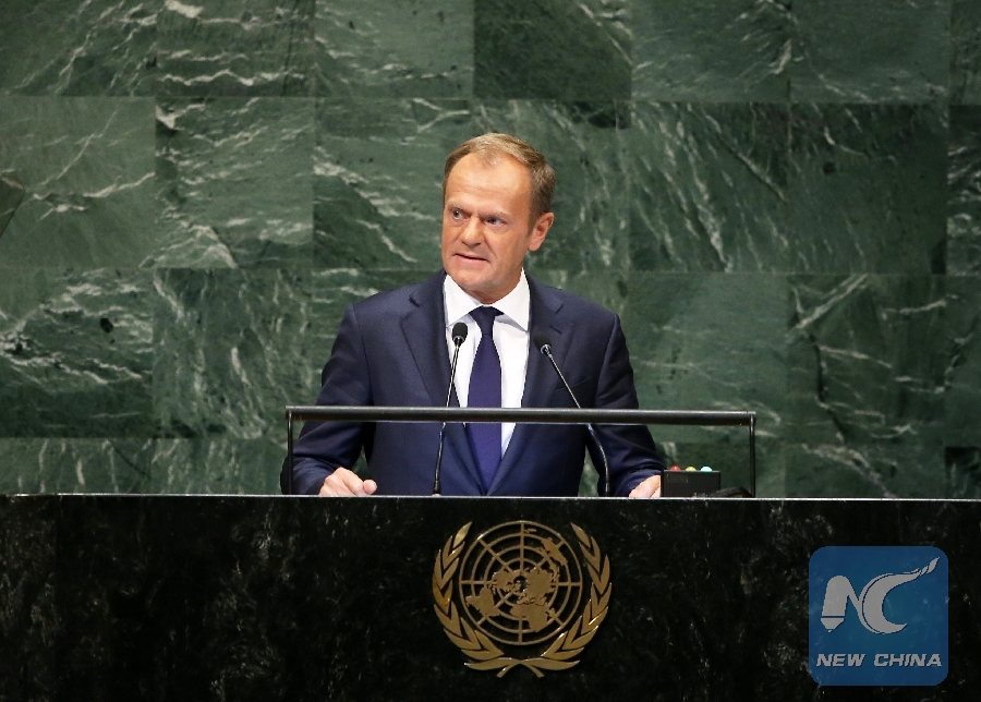 European Council President Donald Tusk addresses the General Debate of the 73rd session of the United Nations General Assembly at the UN headquarters in New York, on Sept. 27, 2018. (Xinhua/Qin Lang)