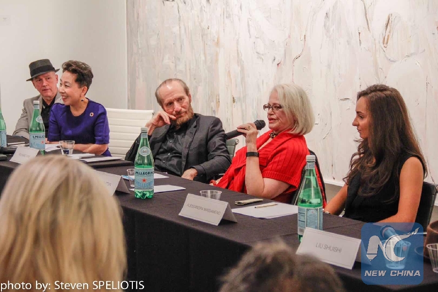Photo taken on Oct. 14, 2018 shows panelists discussing the significance of Chinese artist Liu Shuishi's paintings, Liu's identity and influence as well as challenges facing today's artists worldwide at an exhibition titled "Liu Shuishi Retrospective" in New York. (Xinhua)