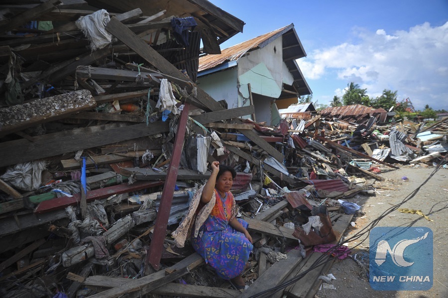 An Indonesian woman sits on debris near her house after an earthquake and tsunami at Pantoloan port in Poso, Central Sulawesi Province, Indonesia, on Oct. 10, 2018. (Xinhua/Zulkarnain)