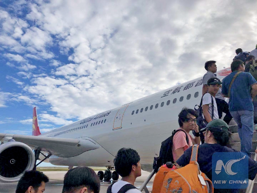 Chinese tourists get on board to fly back home in Saipan, the Commonwealth of the Northern Mariana Islands (CNMI), Oct. 28, 2018. (Xinhua)