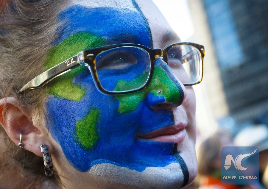 File Photo: A participant puts on an earth pattern face paint during the Global Climate March in Vancouver, Canada, Nov. 29, 2015. (Xinhua/Liang Sen)