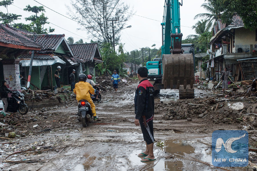 An excavator cleans road from debris after a tsunami hit Sunda Strait in Pandeglang, Banten province, in Indonesia, Dec. 23, 2018. (Xinhua/Veri Sanovri)