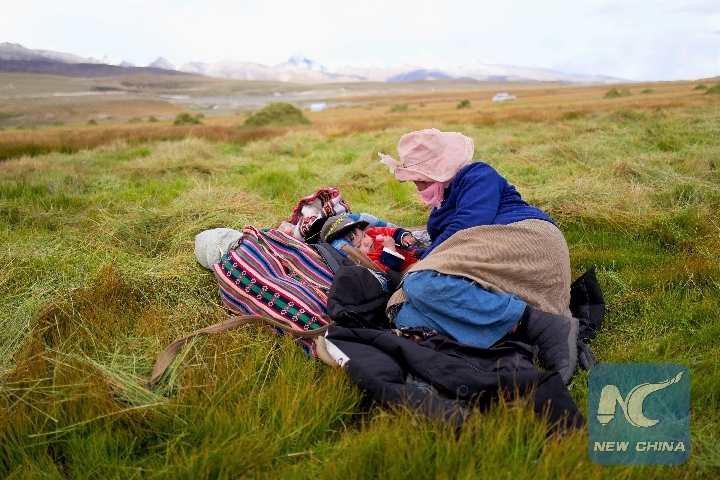 A woman looks after her child during the break of mowing on a pasture in Damxung County, southwest China's Tibet Autonomous Region, Oct. 2, 2018. (Xinhua/Purbu Zhaxi)