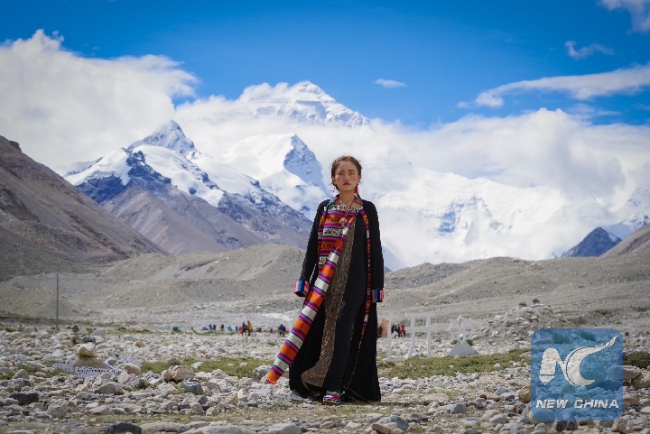 A model presents a creation during a folk costume show at the 5,200-meter-high base camp of the world's highest peak Qomolangma, in southwest China's Tibet Autonomous Region, Aug. 18, 2018. (Xinhua/Liu Dongjun)