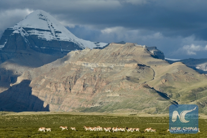 Tibetan wild donkeys are seen at the foot of Mount Kangrinboqe in Ngari Prefecture, southwest China's Tibet Autonomous Region, Sept. 11, 2018. (Xinhua/Purbu Zhaxi)