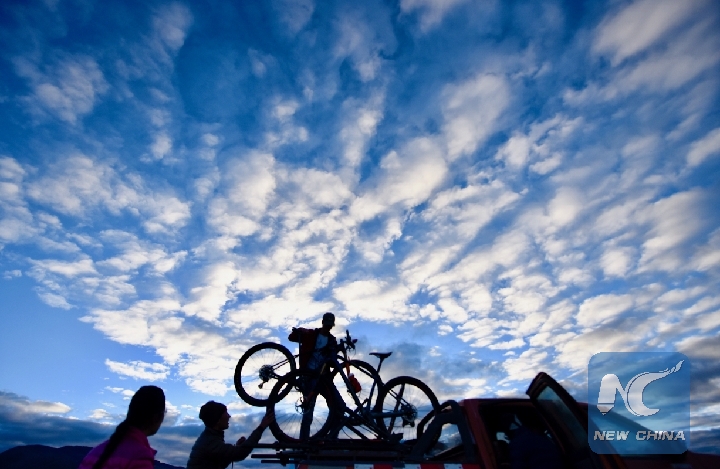 A participant prepares before a cycling race around the holy lake Mapham Yutso in Pulan County of Ngari Prefecture, southwest China's Tibet Autonomous Region, Sept. 9, 2018. (Xinhua/Purbu Zhaxi)