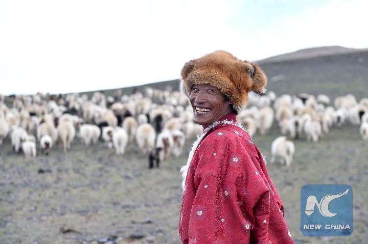 Rigzin, 49, smiles while grazing a flock of sheep in Rungma Town of Nyima County, southwest China's Tibet Autonomous Region, June 14, 2018. Rigzin and his family are to be relocated to a new home in Lhasa. (Xinhua/Chogo)