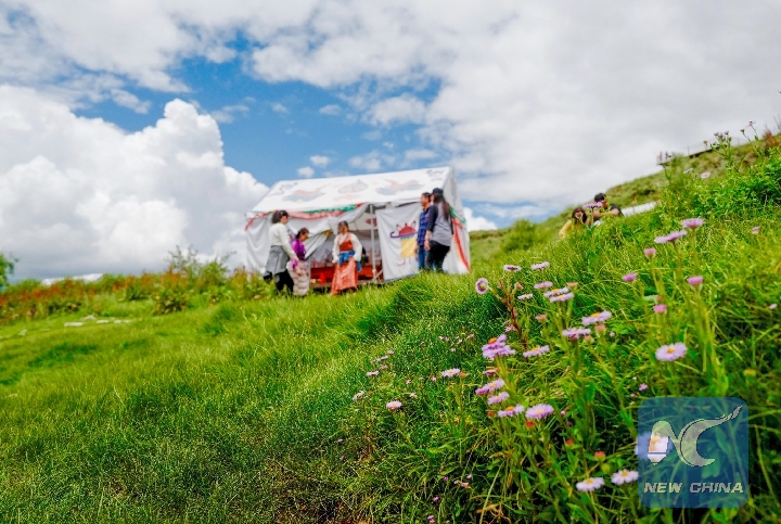 People enjoy "lingka", meaning leisure time in woods, in the outskirts of Lhasa, capital of southwest China's Tibet Autonomous Region, Aug. 4, 2018. (Xinhua/Liu Jie)