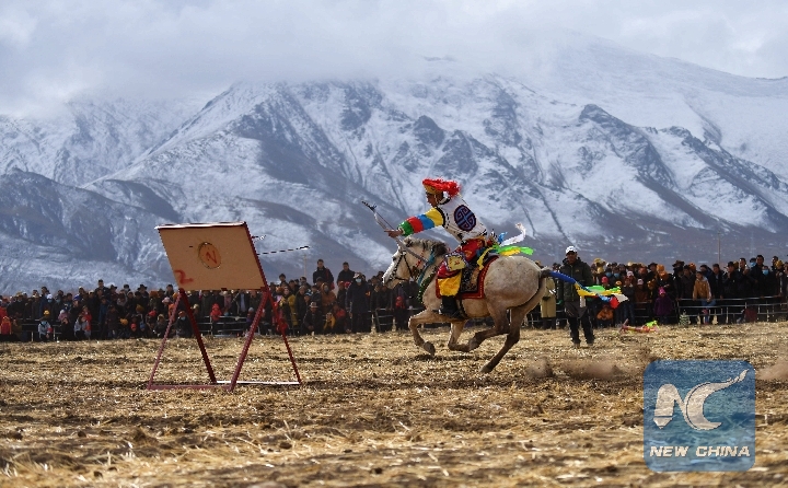 An archer shoots on horseback in an equestrian event in Jiangjiao Village of Lhasa, capital of southwest China's Tibet Autonomous Region, Feb. 25, 2018. (Xinhua/Jigme Dorje)