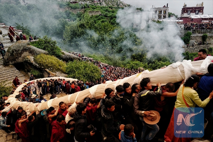 Buddhists and tourists participate in the sacred "sunning of the Buddha" ceremony to mark the start of the annual Shoton festival at the Zhaibung Monastery in Lhasa, capital of southwest China's Tibet Autonomous Region, Aug. 11, 2018. (Xinhua/Purbu Zhaxi)
