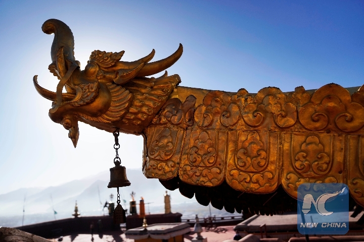 Photo taken on Nov. 7, 2018 shows a roof decoration of the Potala Palace in Lhasa, capital of southwest China's Tibet Autonomous Region. The golden roofs of the Potala Palace shine in glory after more than 18 months of renovation work. (Xinhua/Purbu Zhaxi)
