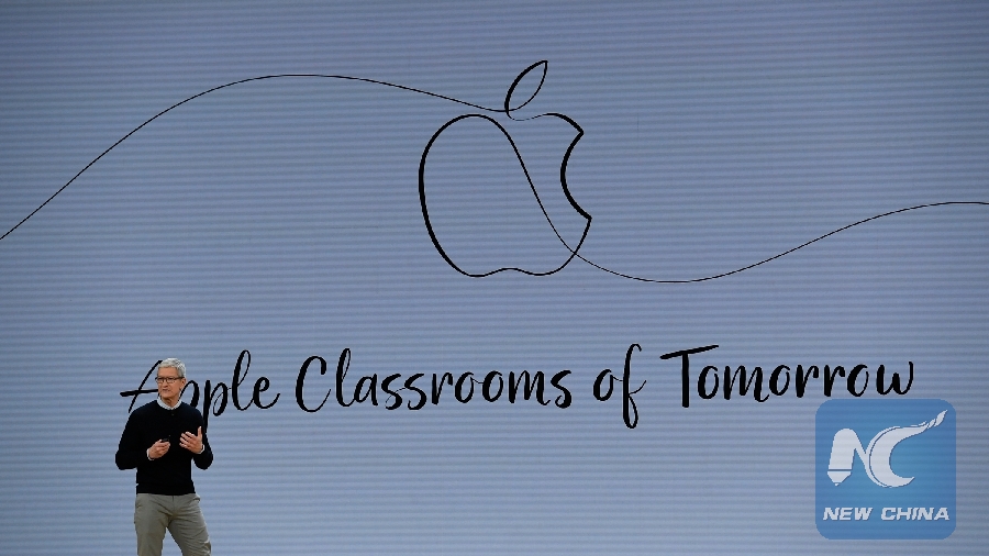 File Photo: Apple CEO Tim Cook introduces a new iPad in Chicago, the United States, on March 27, 2018. (Xinhua/Xinhua)
