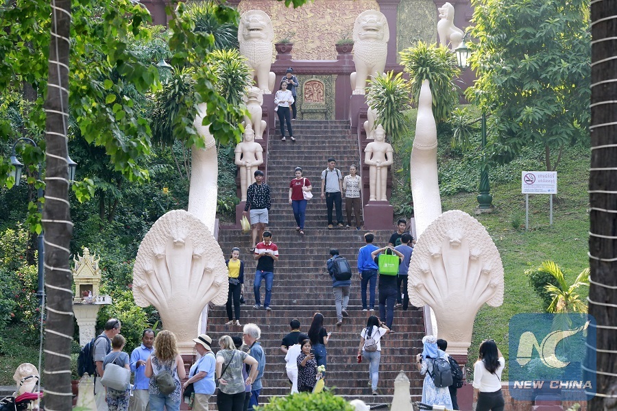 Tourists visit the Wat Phnom historic site in Phnom Penh, Cambodia, on Jan. 29, 2019. (Xinhua/Phearum)