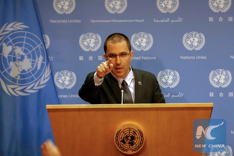 File Photo: Venezuelan Foreign Minister Jorge Arreaza speaks to journalists during a press conference at the UN headquarters in New York, on Feb. 12, 2019. (Xinhua/Li Muzi)