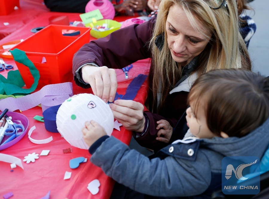 A child makes a Chinese lantern with his mother during a celebration of Chinese Lunar New Year at the Original Farmers Market in Los Angeles, the United States, Feb. 17, 2019. (Xinhua/Li Ying)