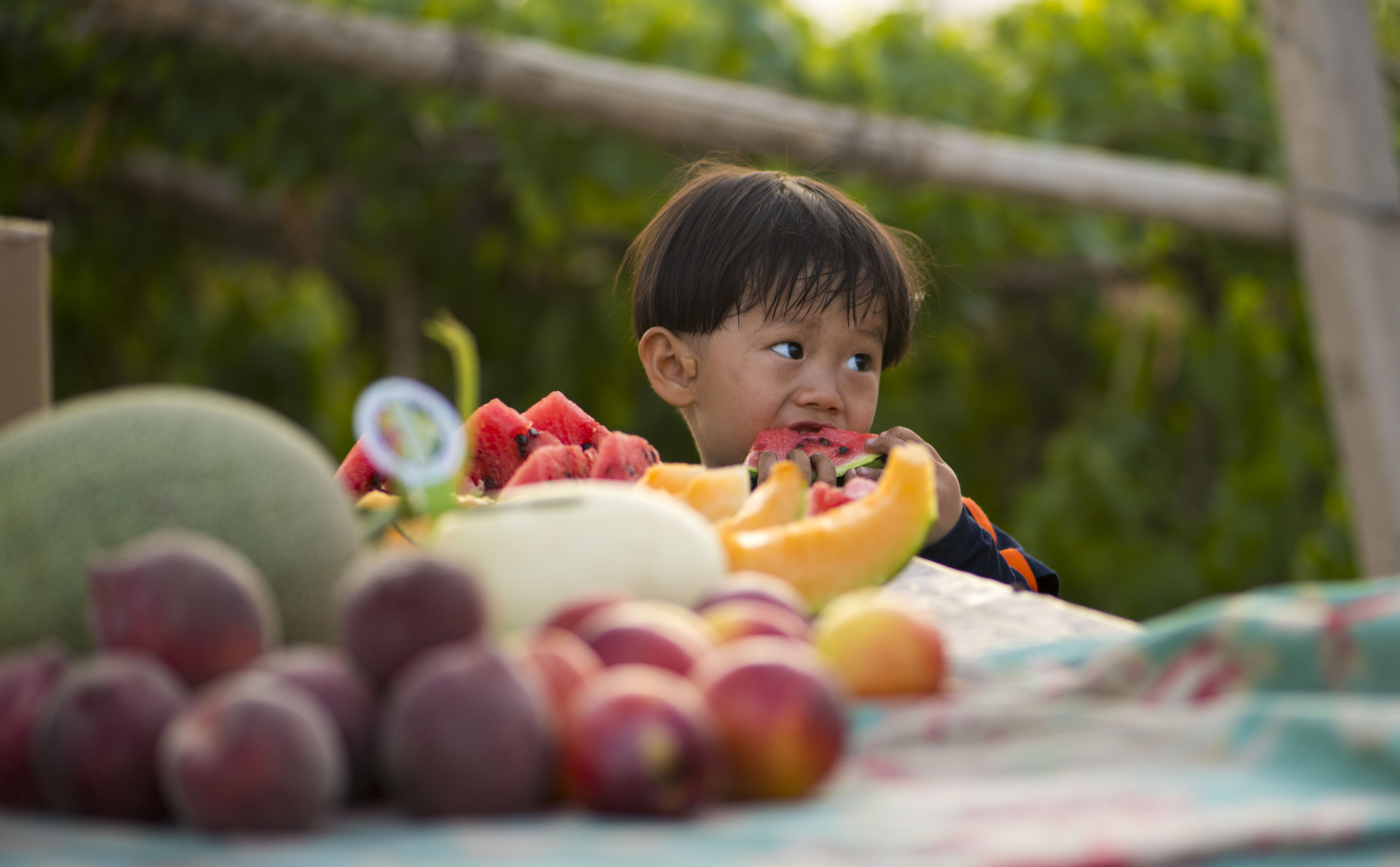 A child eats watermelon in Turpan, northwest China's Xinjiang Uygur Autonomous Region. Xinjiang is famous for its bounty of fruits, including grapes, melons, pears. (Xinhua/Jiang Wenyao)