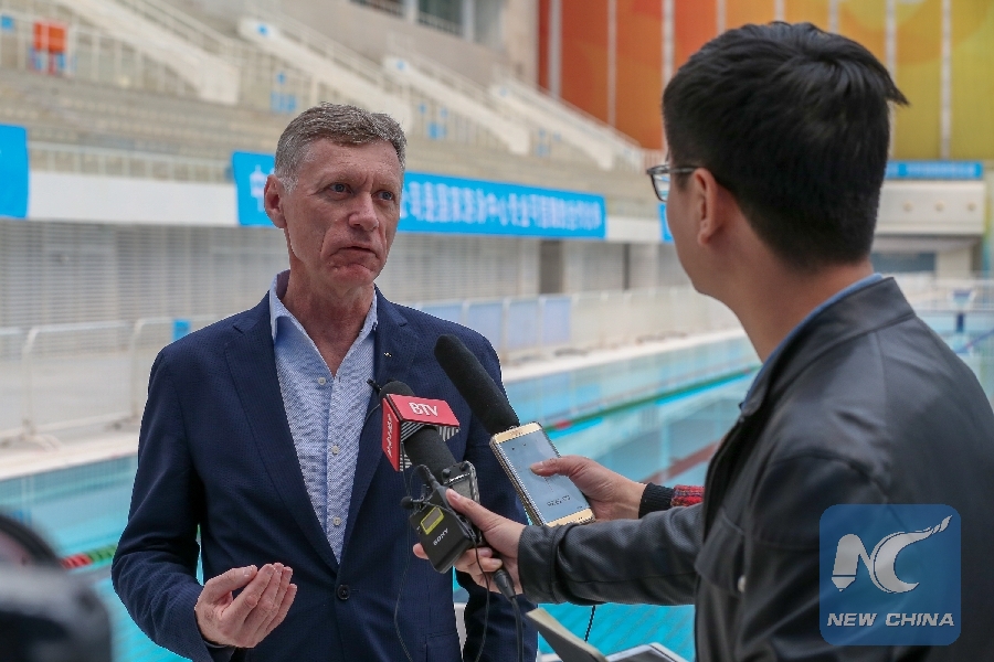 Anthony Edgar, head of IOC media operations, talks to Xinhua during agency representatives' tour to the 2022 Winter Games facilities around Beijing on April 8, 2019. (Xinhua/Ju Huanzong)