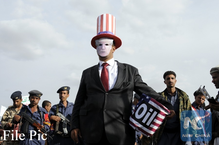 A Yemeni protester(C) wears a mask with the face of U.S. President Donald Trump during an anti-U.S. protest in Sanaa, Yemen, on May 20, 2017. (Xinhua File photo)
