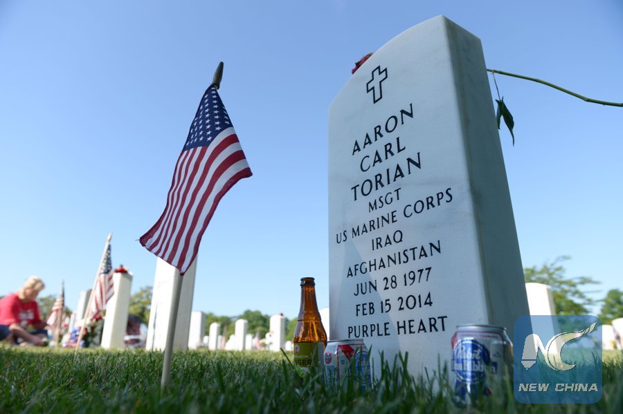 The file photo shows that a can of beer is seen beside the tomb of Aaron Torian at the section 60 of ArlingtonNational Cemetery, outside Washington D.C., the United States, May 26, 2014. People crowded in Arlington National Cemetery, especially in Section 60, where America's most recent war deads lie, during the memorial day.(Xinhua/Yin Bogu)