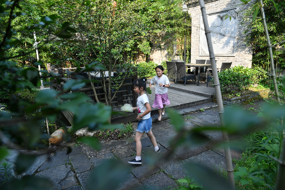 Two girls enjoy themselves at the garden of a hotel in Wuyuan County, east China's Jiangxi Province, June 28, 2019. (Xinhua/Sun Ruibo)
