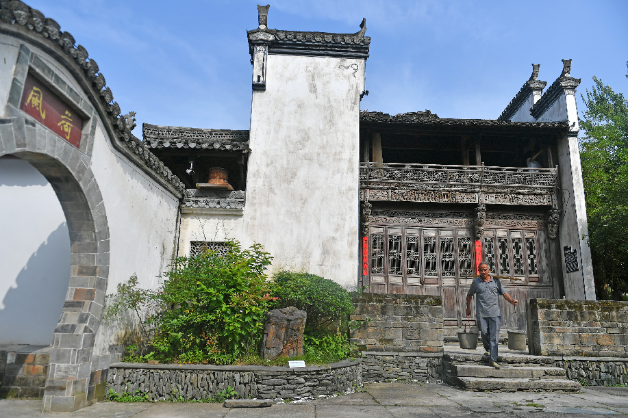 Liu Fang (C), a hotel owner, introduces the history of a Hui-style building in Wuyuan County, east China's Jiangxi Province, June 28, 2019. (Xinhua/Zhang Ruiqi)
