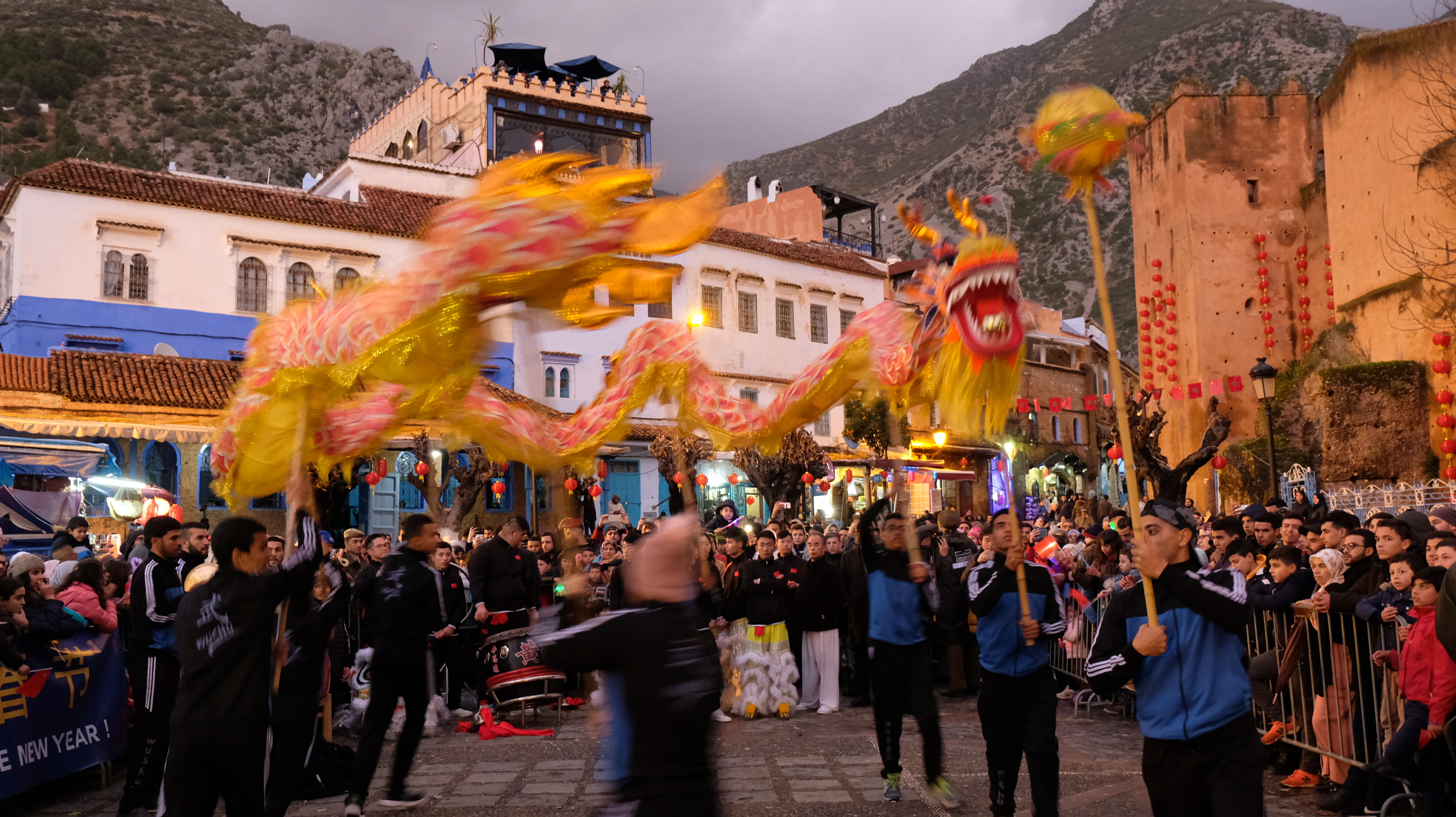 Members of the Royal Moroccan Martial Arts Association perform dragon dance in the medina of Chefchaouen, on Feb. 1, 2019. (Xinhua/Chen Binjie)