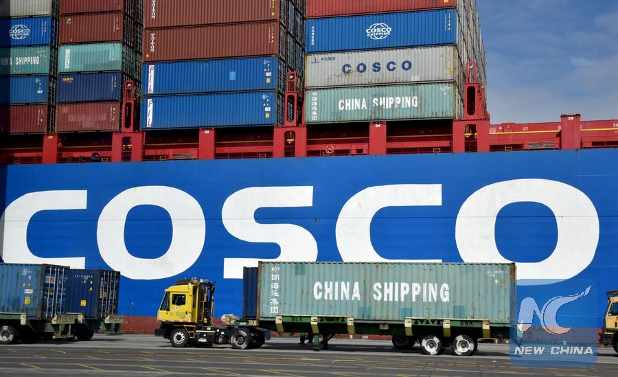 File Photo: Containers of China COSCO Shipping Corporation Limited are seen at the Port of Long Beach, Los Angeles County, the United States, on Feb. 27, 2019. (Xinhua/Li Ying)
