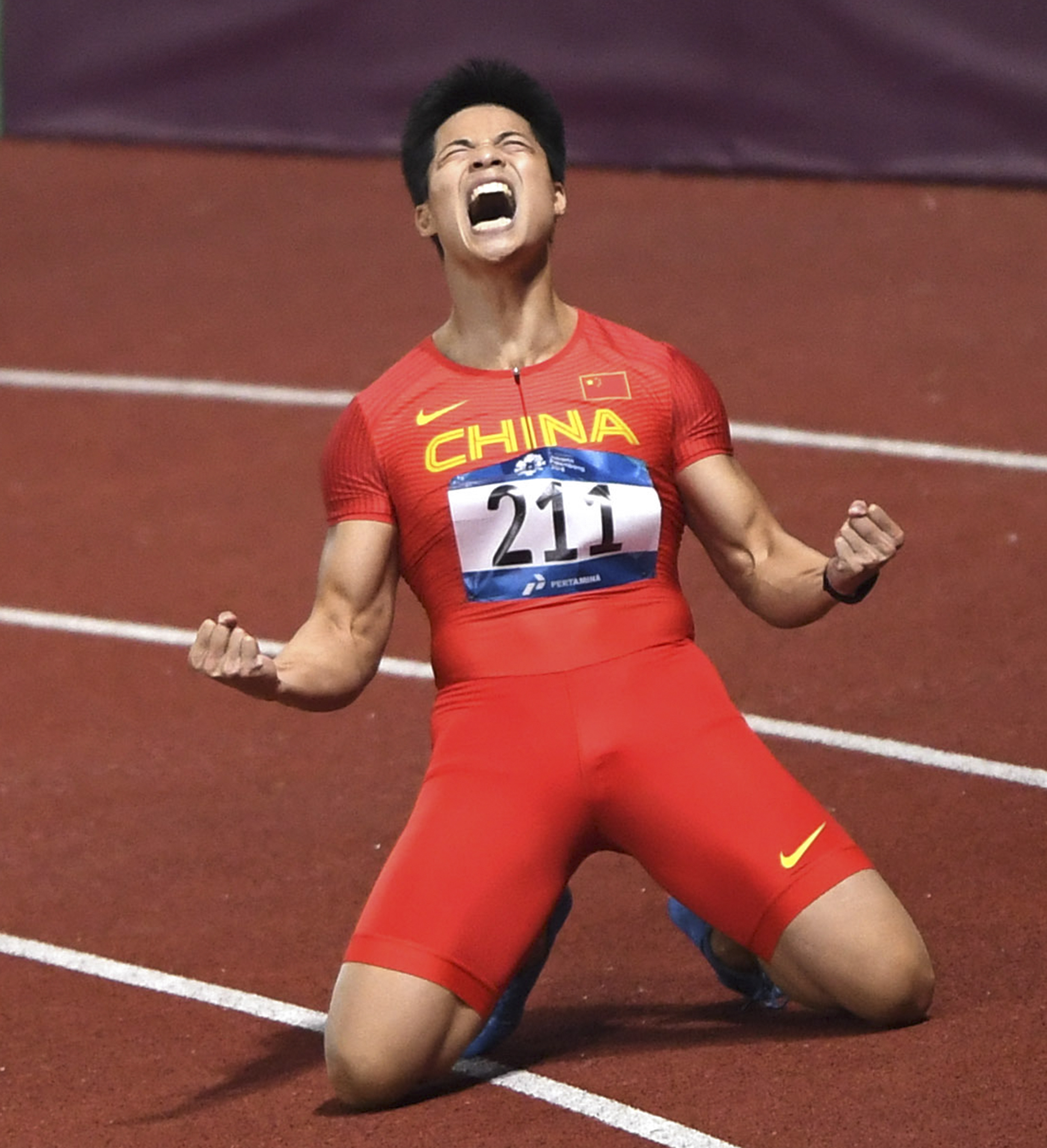 Su Bingtian celebrates after the men's 100m final of athletics at the Asian Games 2018 in Jakarta, Indonesia. Su claimed the gold medal with a game-record 9.92 seconds. (Xinhua/Pan Yulong)