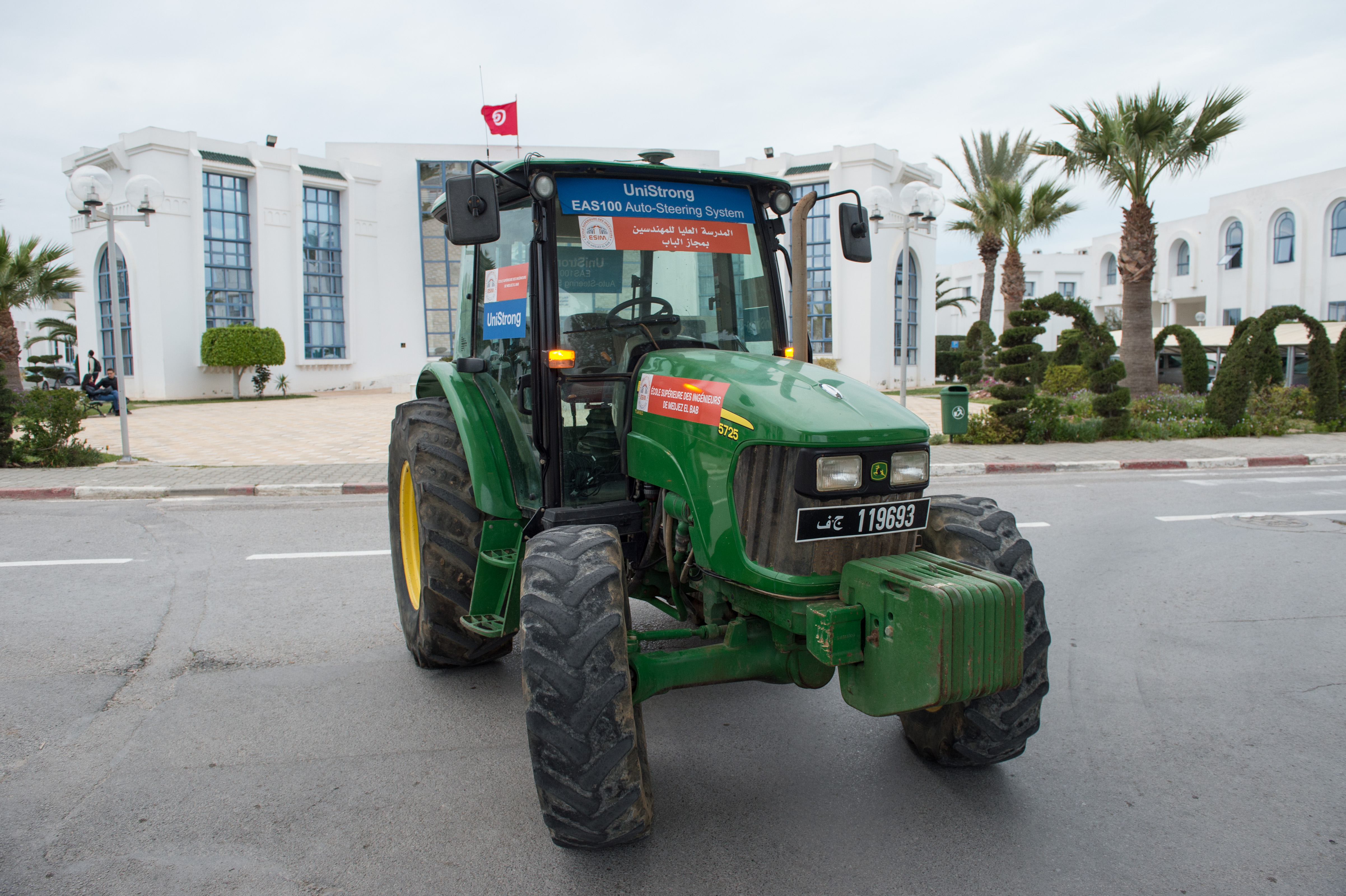 A self-driving tractor equipped with the BeiDou Navigation Satellite System (BDS) runs along the planned routes through remote control during the second China-Arab States BDS Cooperation Forum in Tunis, capital of Tunisia, April 1, 2019. (Xinhua/Meng Tao)
