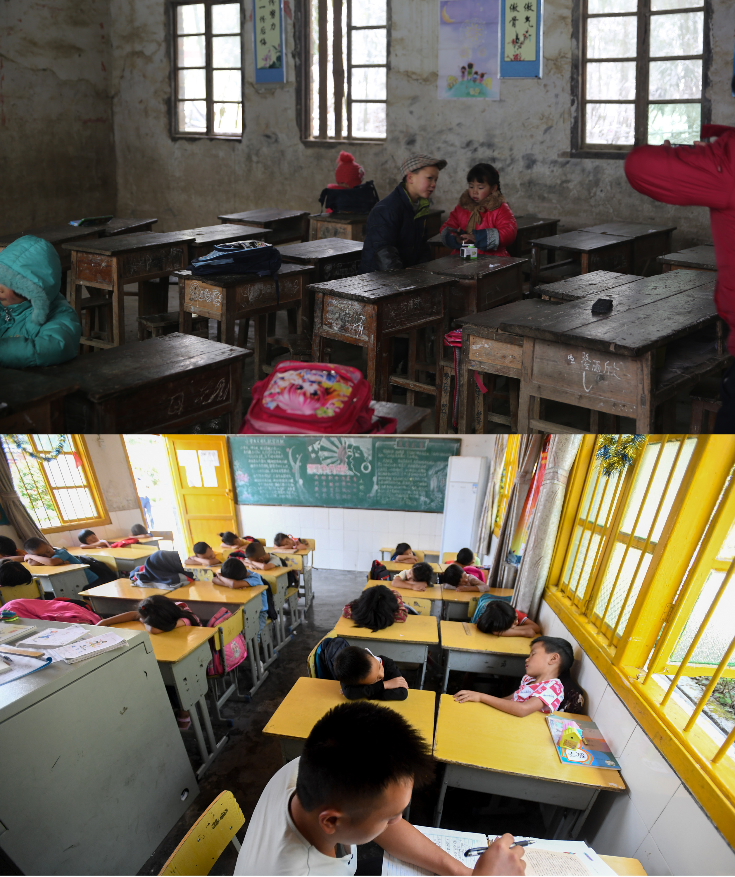Combo photo shows the classroom before renovation of the Shibadong Primary School in Shuanglong Town of Xiangxi Tujia and Miao Autonomous Prefecture, central China's Hunan Province, Feb. 14, 2014 (Top, file photo) and students taking nap at the renovated classroom of the Shibadong Primary School on Sept. 5, 2019 (Bottom, photo taken by Chen Zeguo). (Xinhua)