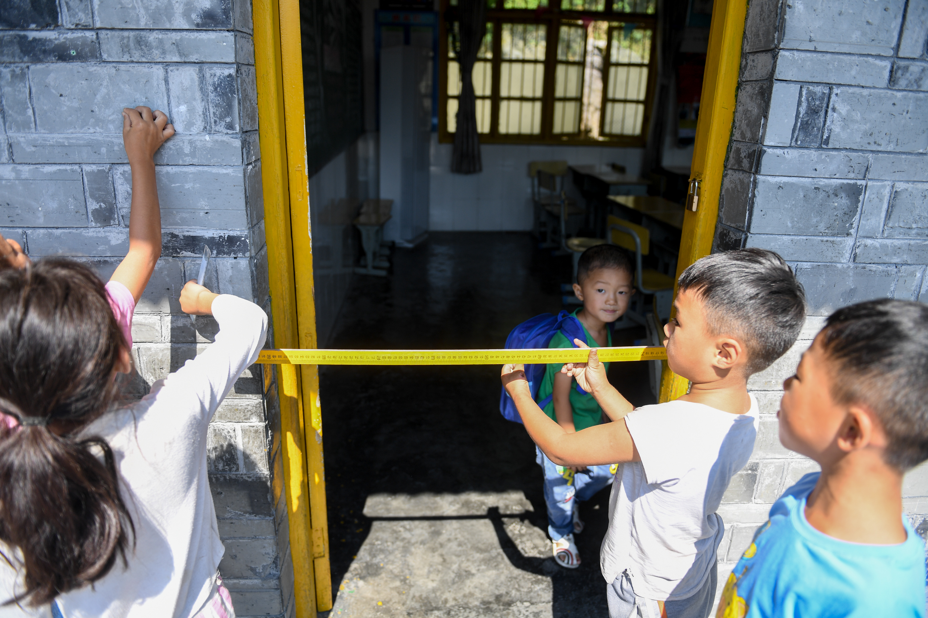 Students review the measurement knowledge after a class at the Shibadong Primary School in Shuanglong Town of Xiangxi Tujia and Miao Autonomous Prefecture, central China's Hunan Province, Sept. 4, 2019. (Xinhua/Chen Zeguo)