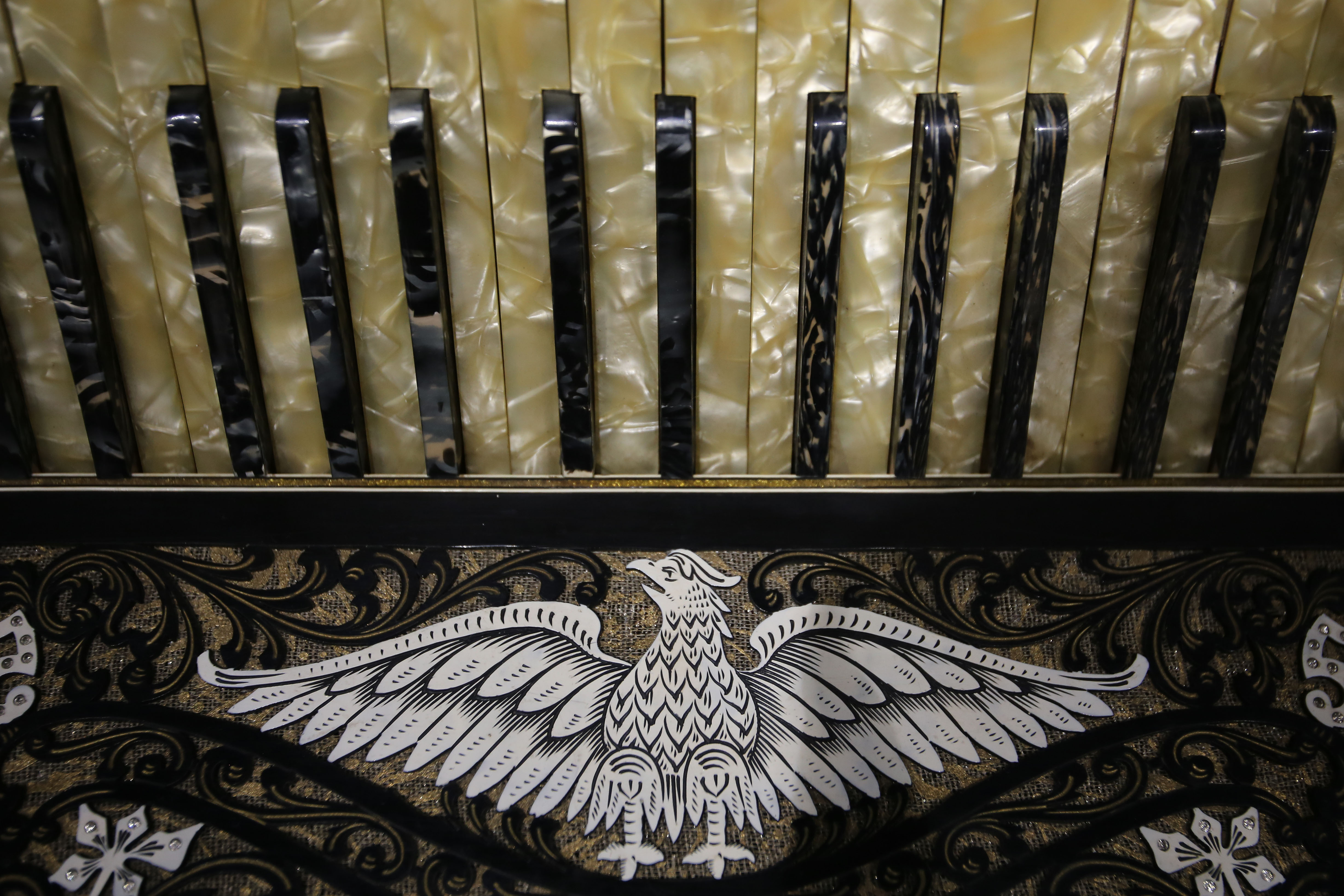 Photo shows the details of an accordion displayed at the Tacheng accordion museum, Sept. 4, 2019. (Xinhua/An Xiya)