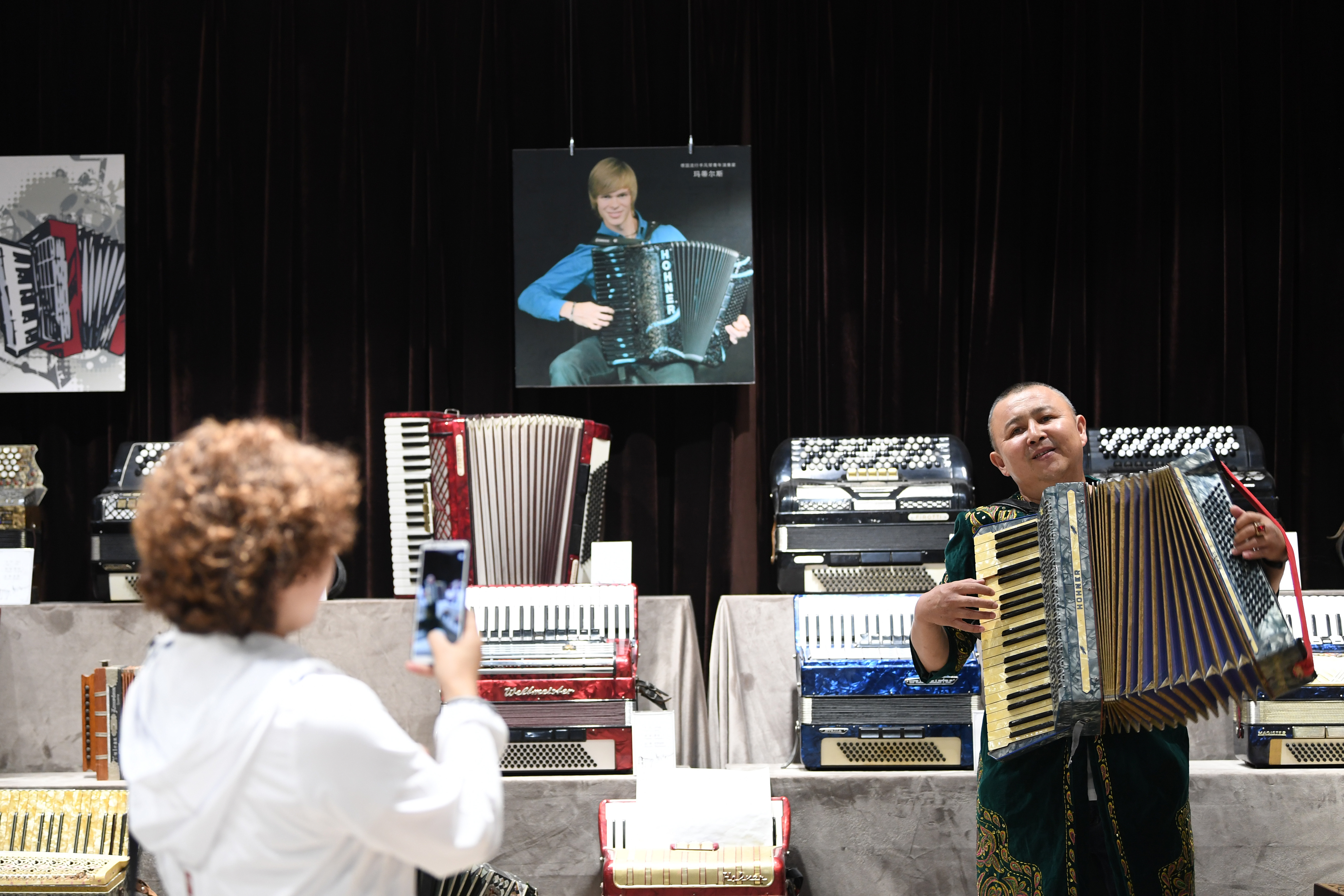 A visitor records a staff playing the accordion at the Tacheng accordion museum, Sept. 4, 2019. (Xinhua/Sadat)