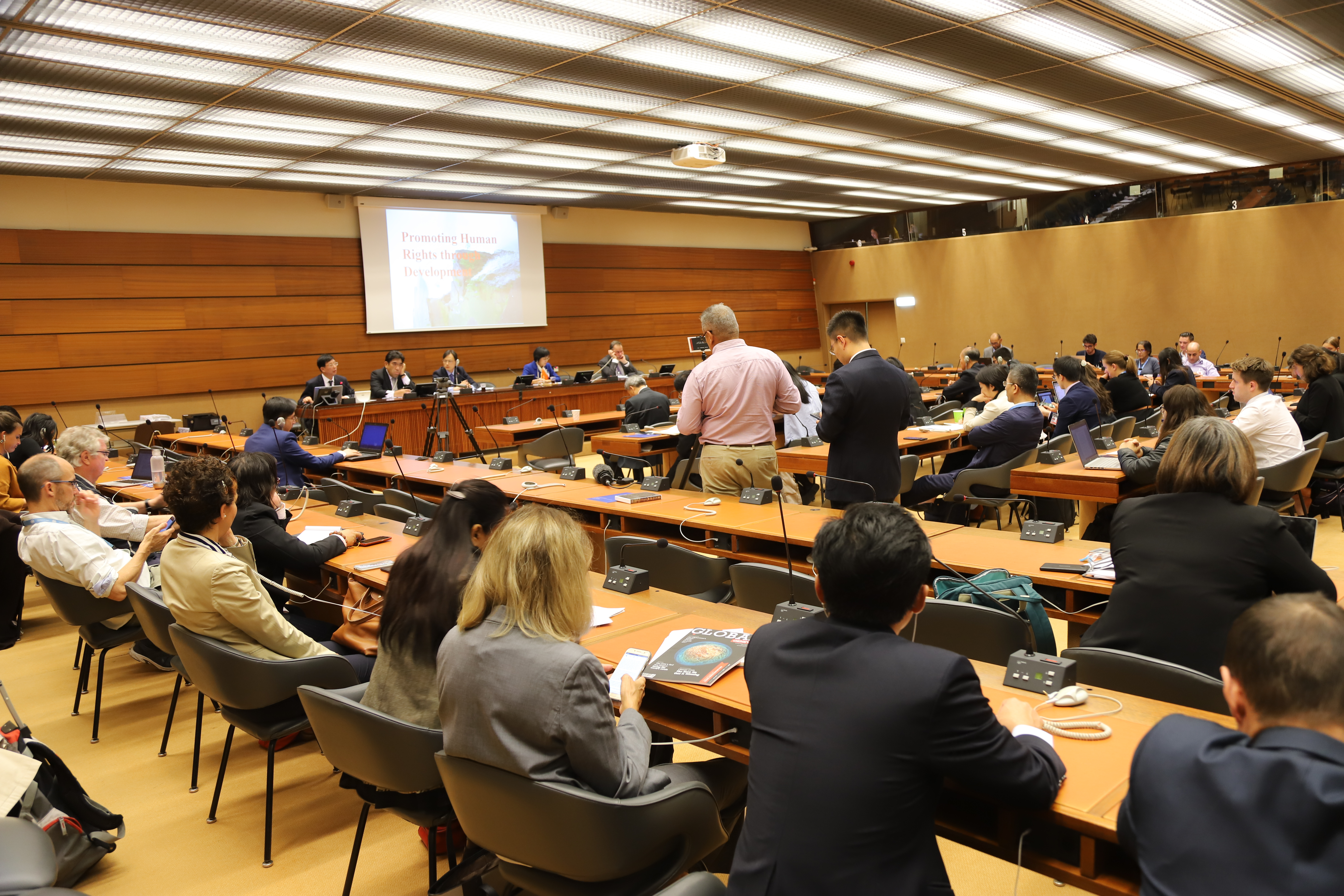 The event, titled "70 Years of the Development of Human Rights in New China," was held by China Society for Human Rights Studies (CSHRS) at the Palais des Nations, as a side-event of the 42nd regular session of the Human Rights Council of the United Nations in Geneva, Switzerland, Sept. 9, 2019. (Xinhua/Chen Junxia)
