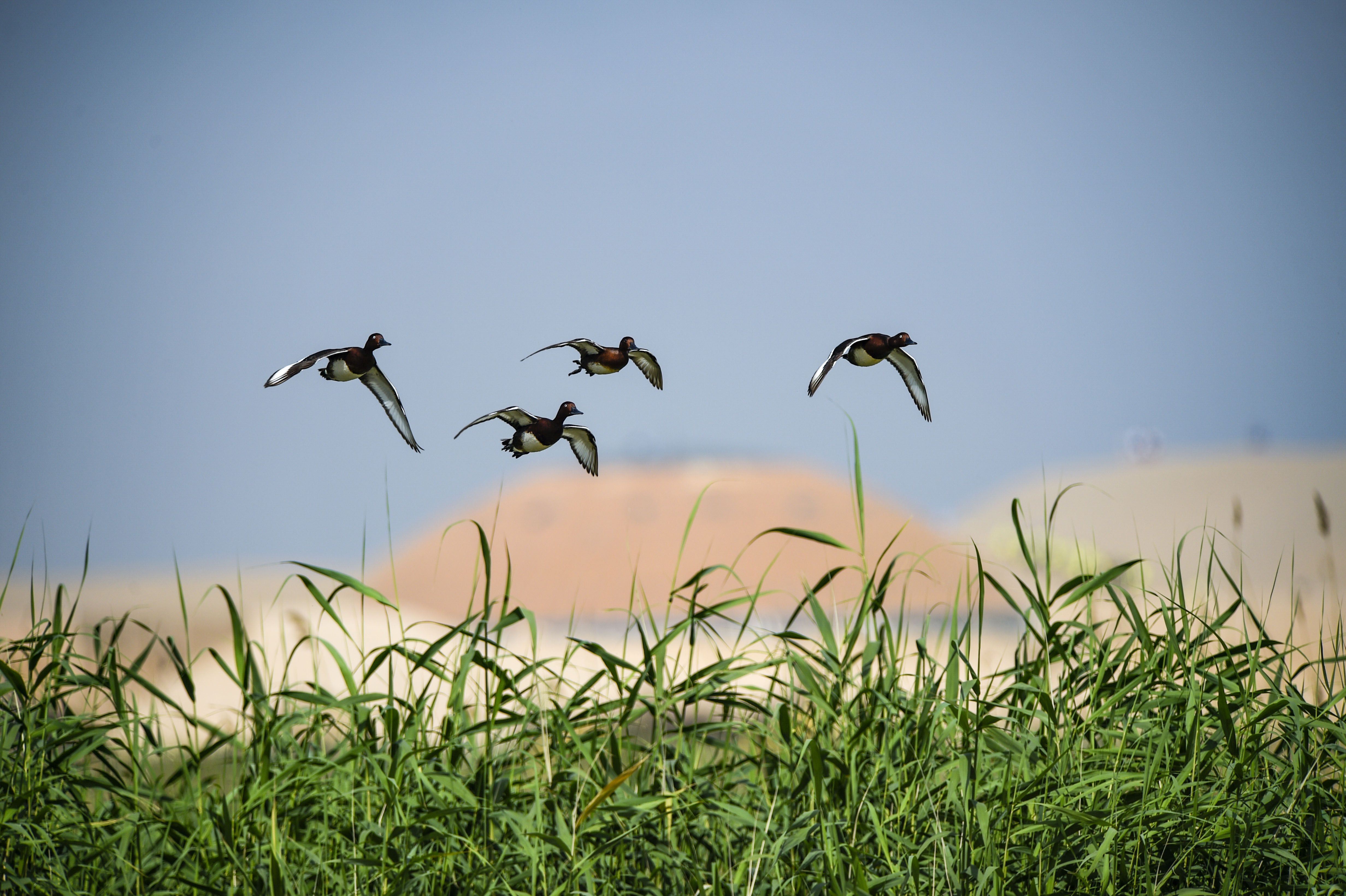 Pochards fly above reed marshes at Shahu scenic spot in Pingluo County, northwest China's Ningxia Hui Autonomous Region. (Xinhua/Feng Kaihua)