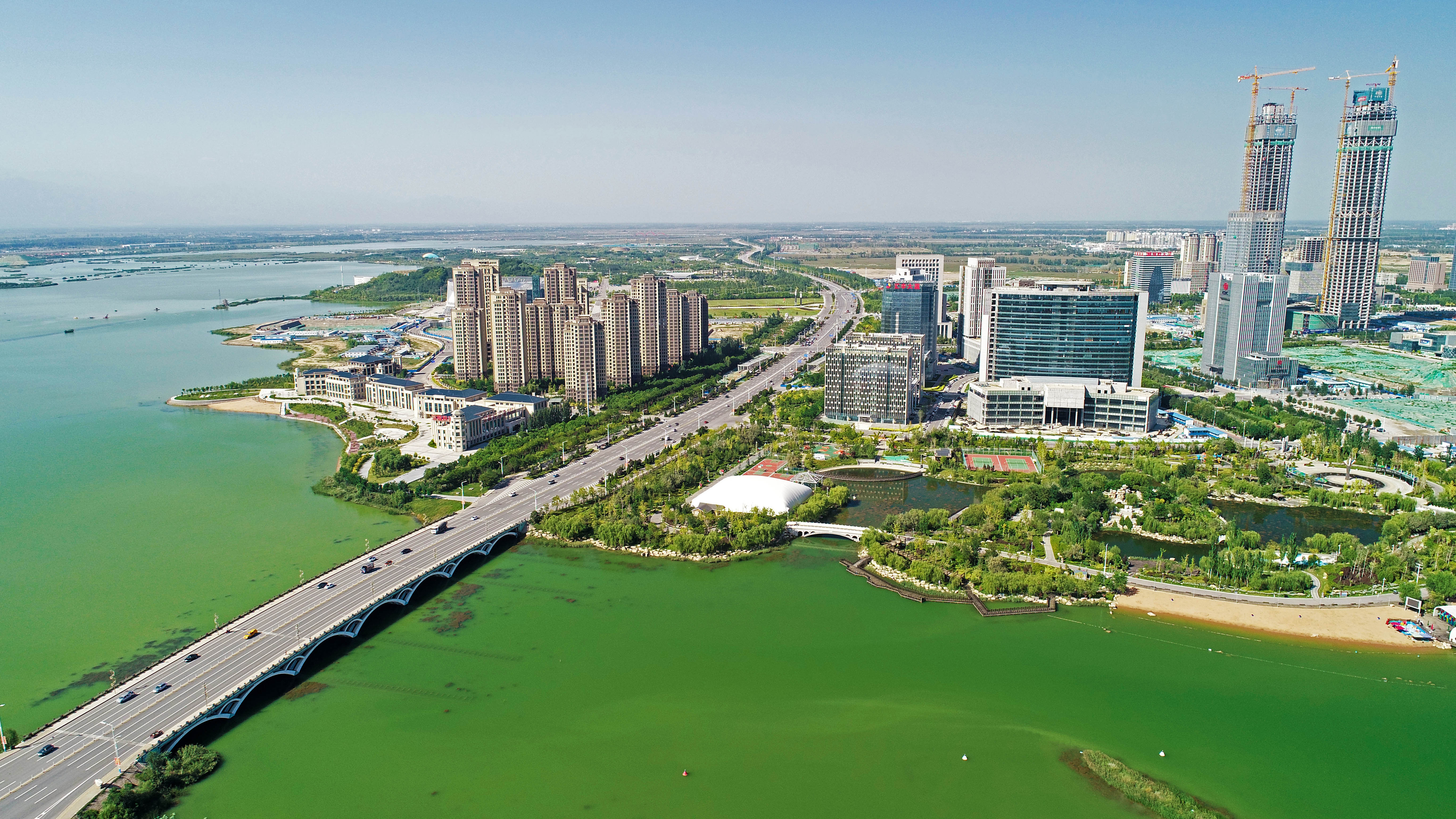 A view of a business district by the Yuehai Lake in Yinchuan, northwest China's Ningxia Hui Autonomous Region. (Xinhua/Wang Peng)