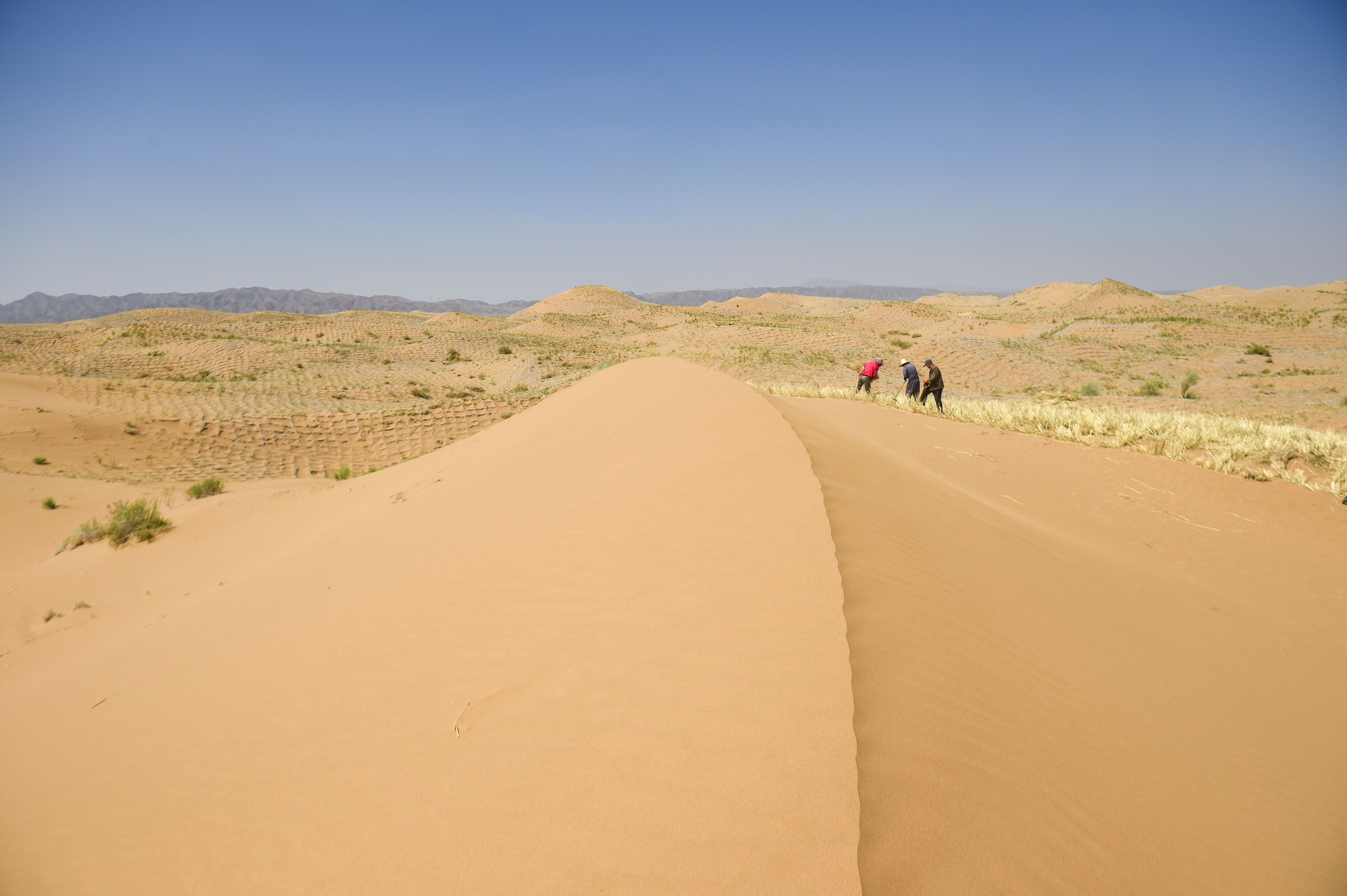 People pave straw checkerboard sand barriers to prevent and control desertification in Changliushui desert area of Zhongwei City, northwest China's Ningxia Hui Autonomous Region. (Xinhua/Feng Kaihua)